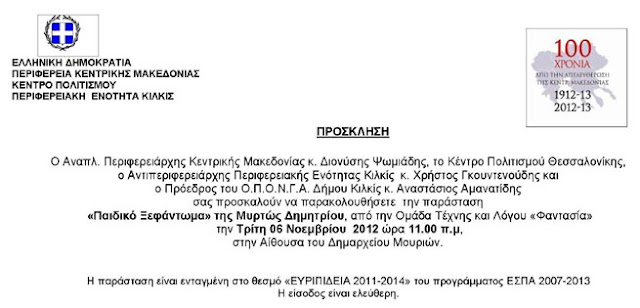 "Πραγματοποιήθηκε την Κυριακή 4 Νοεμβρίου το πρωί, στην θεατρική αίθουσα «Μελίνα Μερκούρη» του Δήμου Αγίου Δημητρίου Αθήνας, το 11ο «Κιλκισιώτικο Αντάμωμα», που πλέον έπειτα από τη αδιάλειπτη διοργάνωσή του από το 2002, έχει γίνει θεσμός, με σημαντικά αποτελέσματα στην προβολή του Νομού Κιλκίς, στην ανάδειξη της ιστορίας του και την συνοχή των Κιλκισιωτών όπου κι αν βρίσκονται.