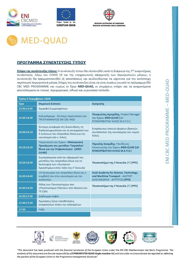 Η συνέντευξη τύπου έχει στόχο να γίνει ευρέως γνωστό στην Ελλάδα και το εξωτερικό, το πρόγραμμα ENI CBC MED και ειδικότερα το Έργο MED-QUAD, οι επιμέρους στόχοι του και τα αναμενόμενα αποτελέσματα σε τοπικό, περιφερειακό, εθνικό και ευρωπαϊκό επίπεδο. Σκοπός του έργου να δημιουργηθούν συνθήκες για την αποτελεσματική αλληλεπίδραση μεταξύ των βασικών συντελεστών που προωθούν την καινοτομία, δηλαδή τα ΑΕΙ/Έρευνα, το Κράτος/Κυβέρνηση, τις Επιχειρήσεις και την Κοινωνία.