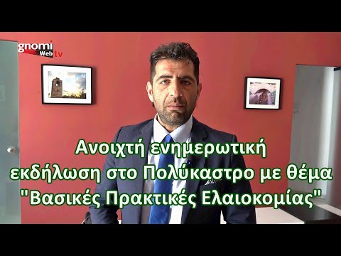 Η καλλιέργεια της ελιάς εξελίσσεται διαρκώς και μαζί της και οι ανάγκες του σύγχρονου παραγωγού. Με στόχο την ενίσχυση της γνώσης και τη στήριξη της αγροτικής κοινότητας, διοργανώθηκε τη Δευτέρα 12 Μαΐου και ώρα 17:00, στο Κέντρο Πολιτισμού Πολυκάστρου, μια ανοιχτή ενημερωτική εκδήλωση με θέμα «Βασικές Πρακτικές Ελαιοκομίας».